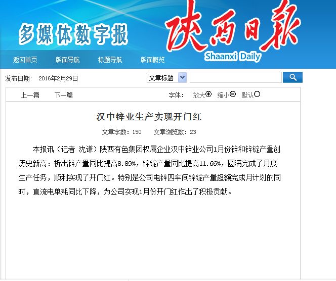 陜西日報 漢中鋅業生產實現開門紅
