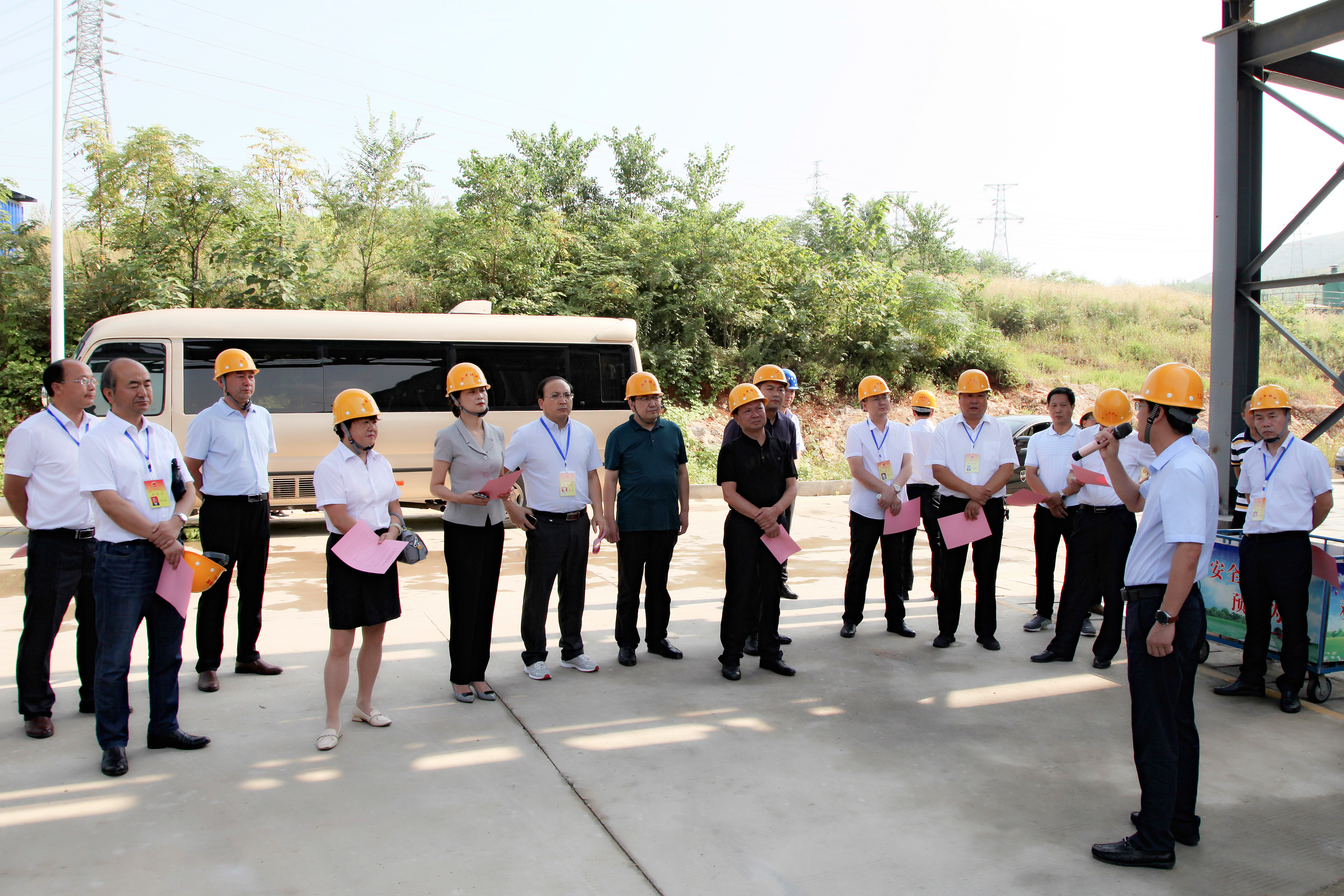 青山環繞,草木蔥蘢。視察組來到山腳下的公司渣綜合利用無害化處理車間,詳細了解浸出渣管理情況、渣處理生產工藝、環保技術以及試生產準備情況,王瑜作了匯報。